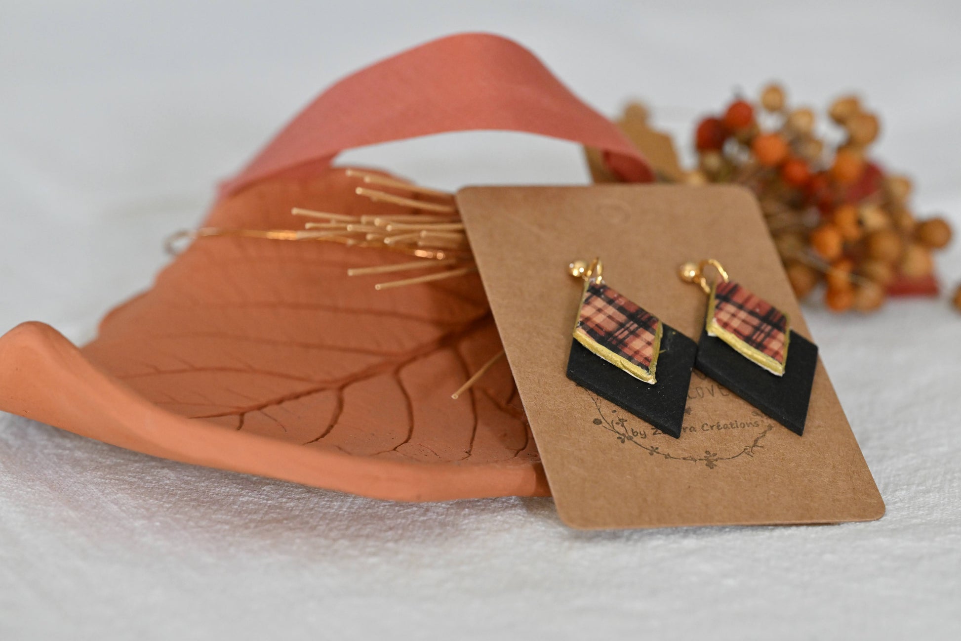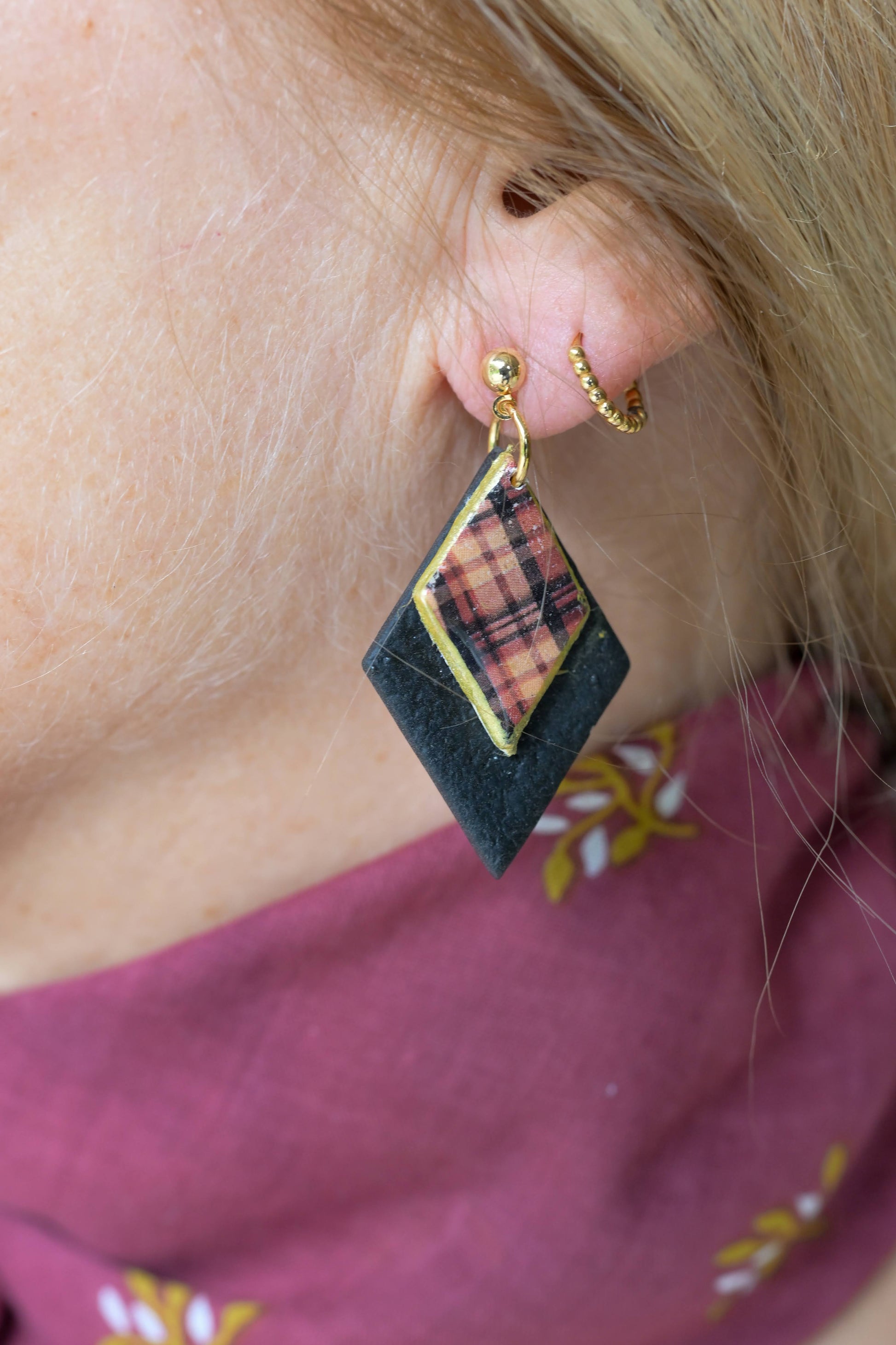 Chaque pièce, façonnée à la main en pâte polymère, se suspend à un clou doré à l’or fin, tel un éclat de feu dans la brume.