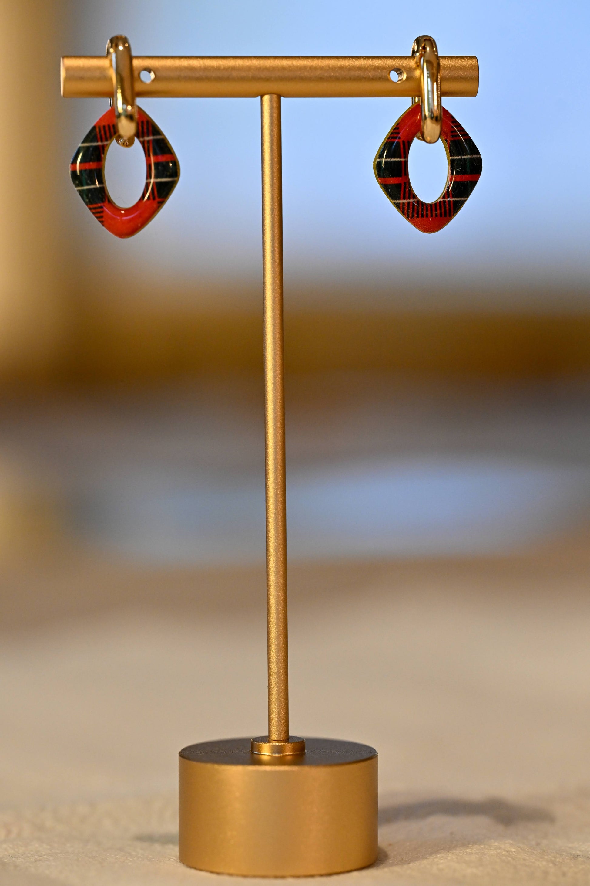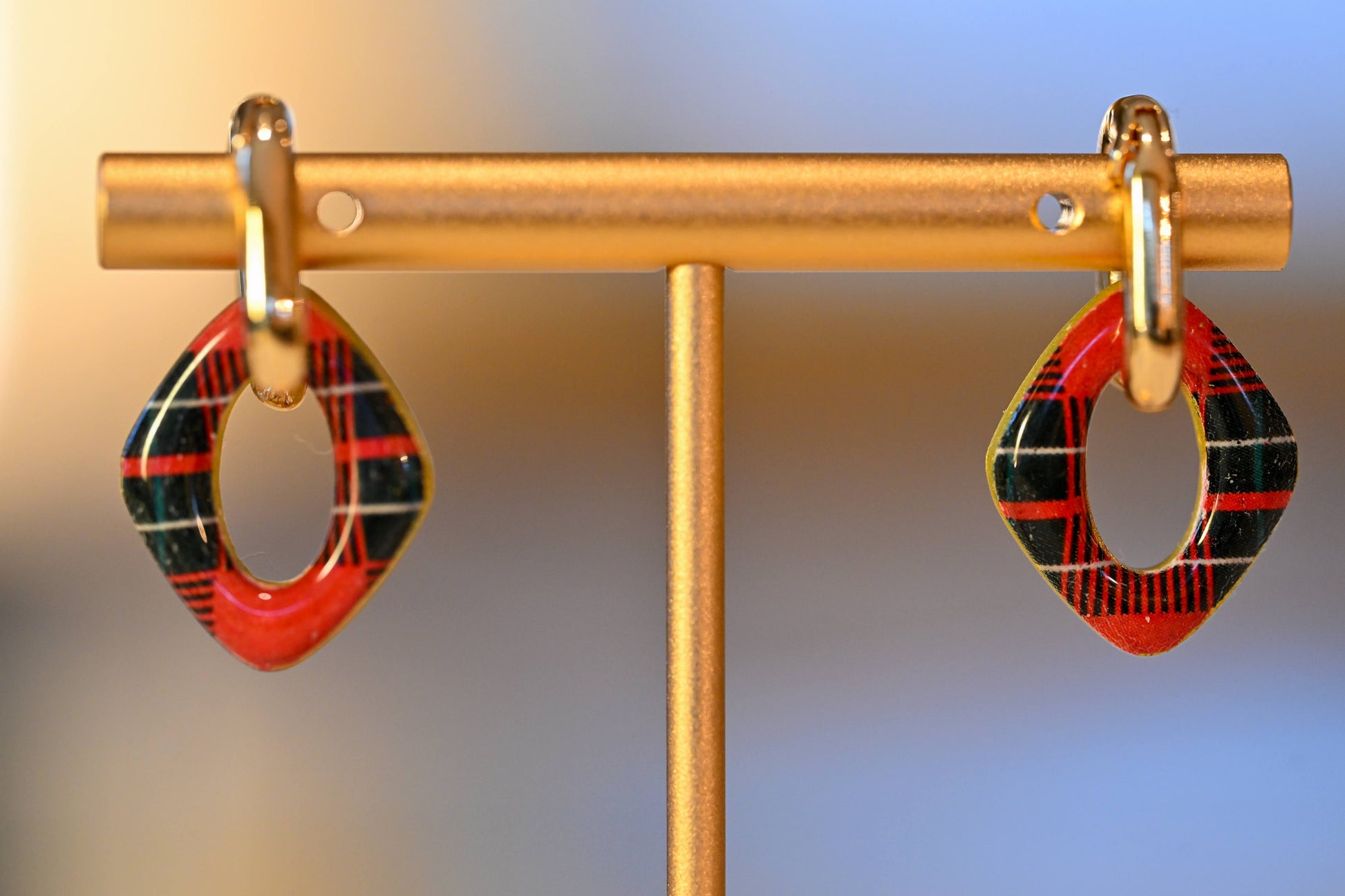 Ces boucles d’oreilles, aux formes ajourées délicatement arrondies, sont habillées d’un motif tartan inspiré des tissus écossais traditionnels, mêlant rouges profonds, verts sombres et lignes contrastées.