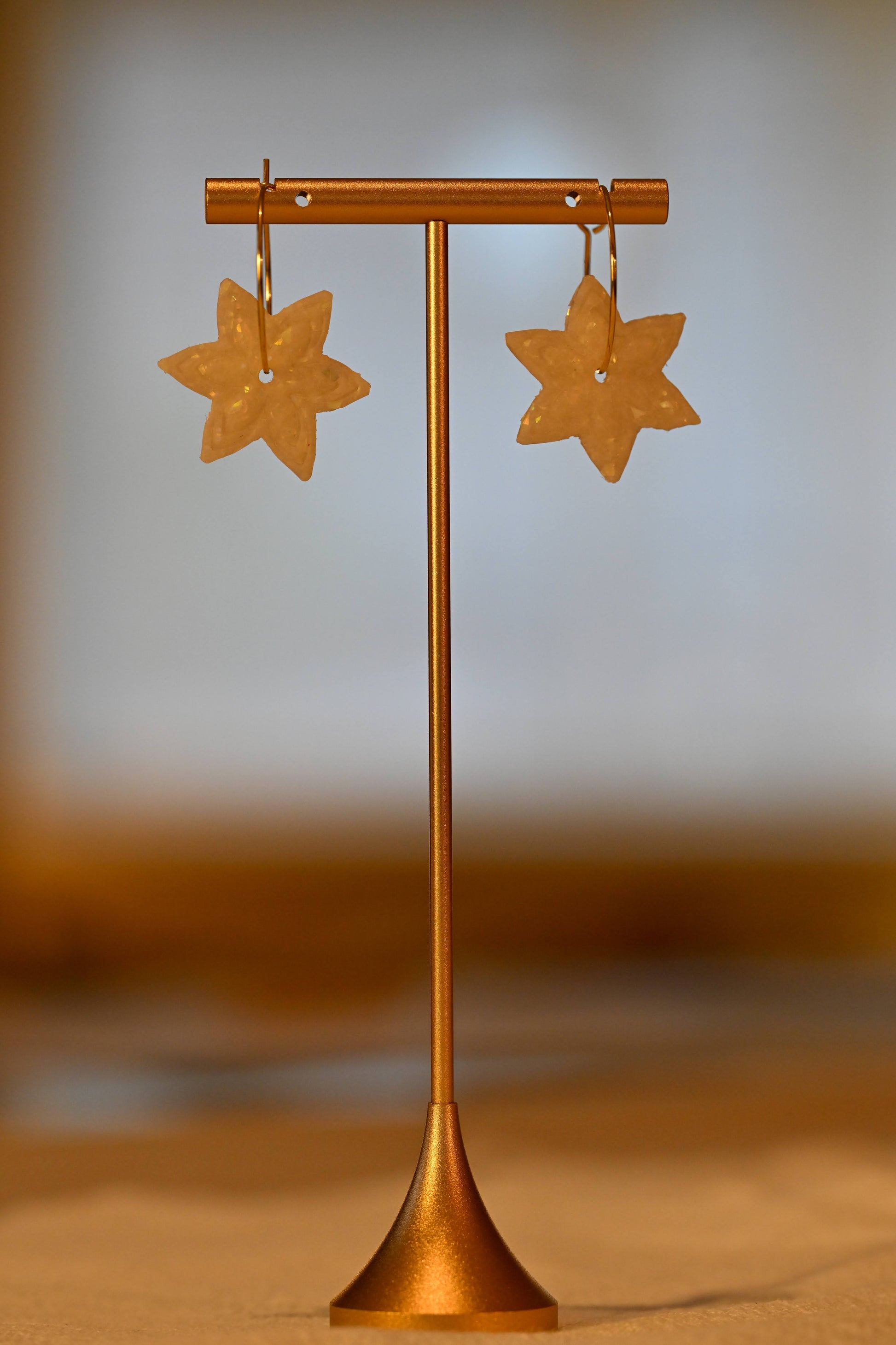 Façonnées à la main en pâte polymère aux reflets nacrés, ces boucles d’oreille laissent apparaître de subtiles inclusions irisées, comme emprisonnées dans la glace. Leur forme étoilée, douce, capte la lumière avec discrétion et poésie.