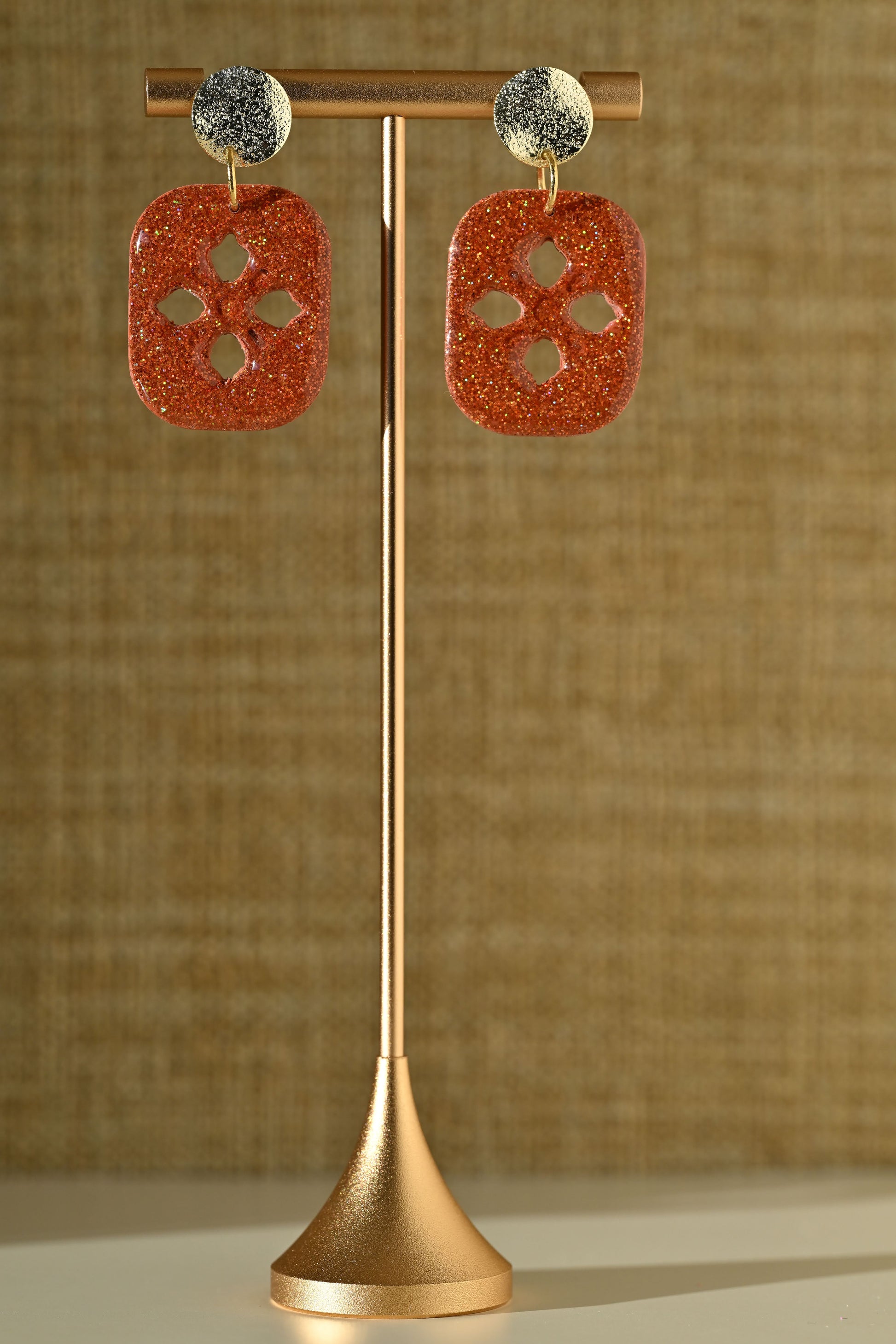 Façonnées à la main en pâte polymère pailletée, ces boucles d’oreille aux reflets cuivrés captent la lumière avec gourmandise. Leurs découpes ajourées rappellent les motifs des sablés de fin d’année, tandis que la dorure à l’or fin apporte une touche précieuse et chaleureuse.