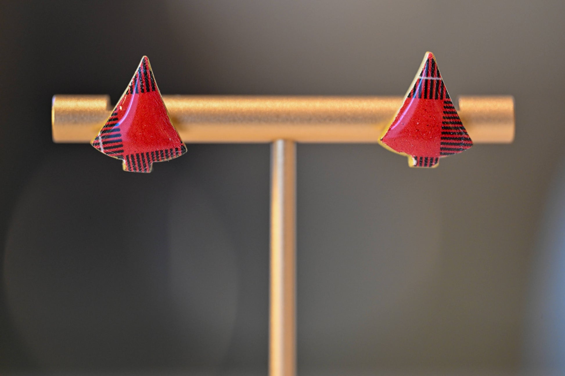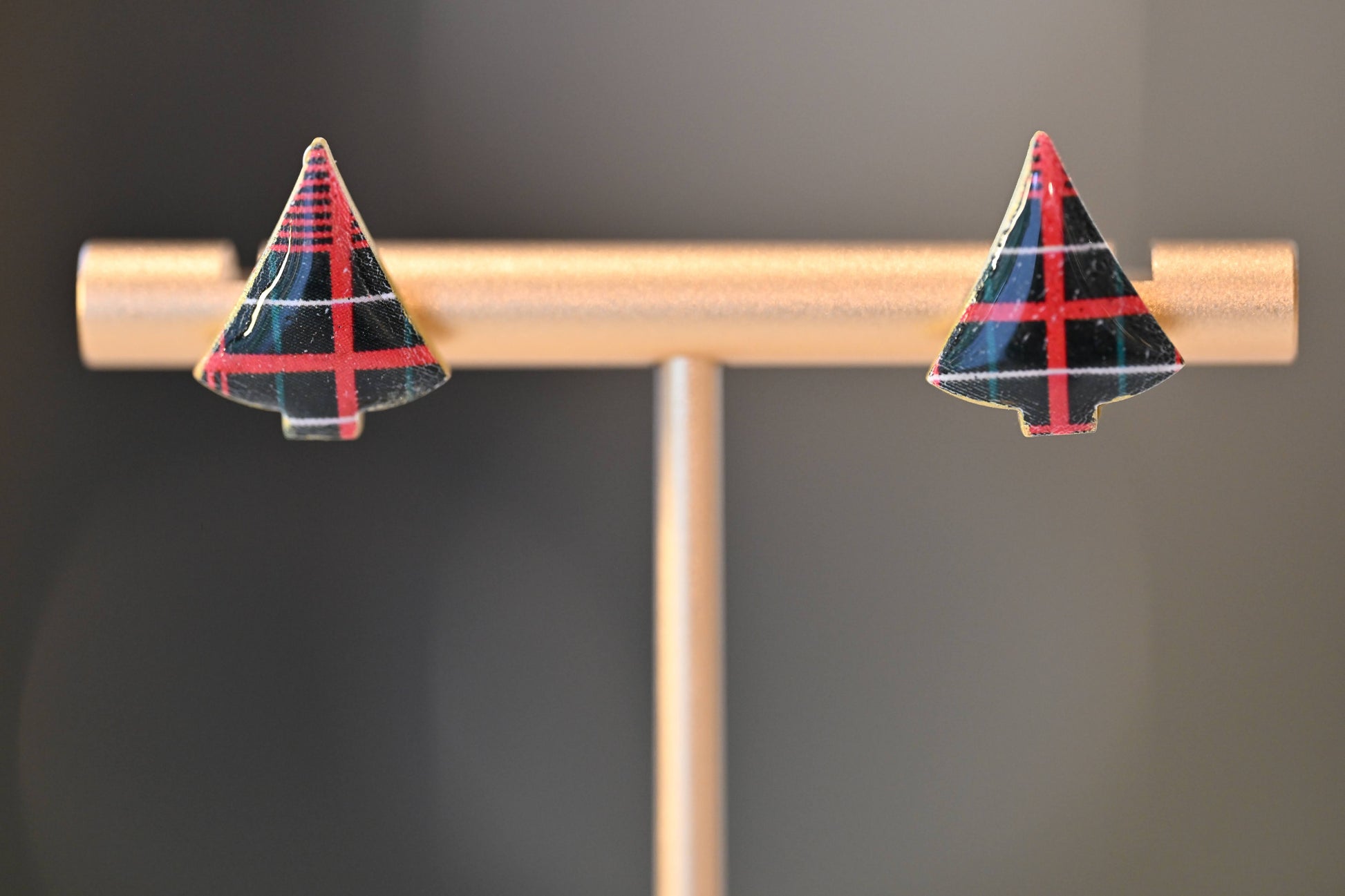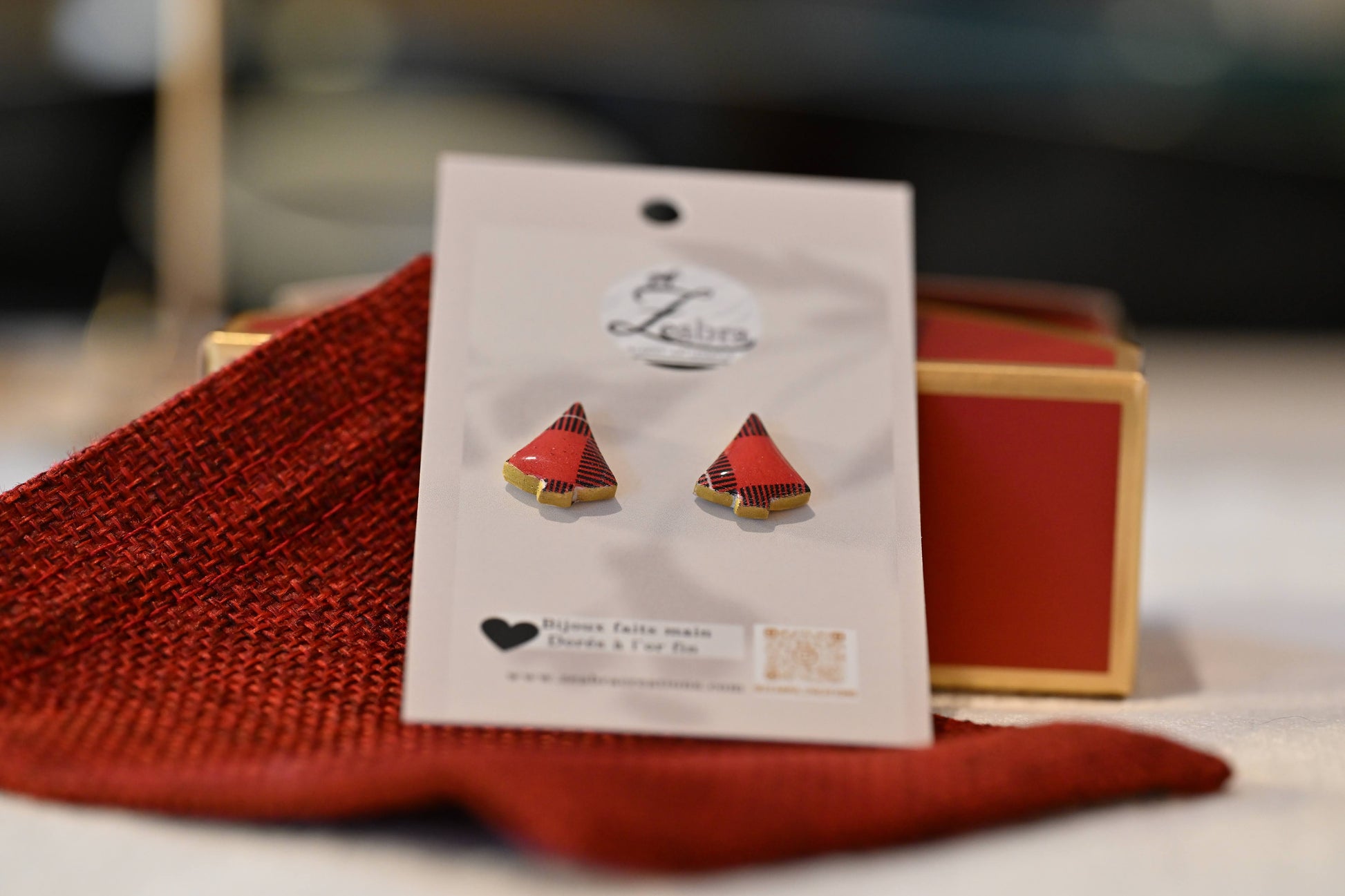 Ces boucles d’oreille en forme de petit sapin sont entièrement façonnées à la main en pâte polymère. Les motifs écossais, aux couleurs rouges, vert profond et touches dorées, varient subtilement selon l’endroit où la pâte est découpée. Chaque paire présente ainsi un dessin légèrement différent, rendant chaque bijou unique et singulier.