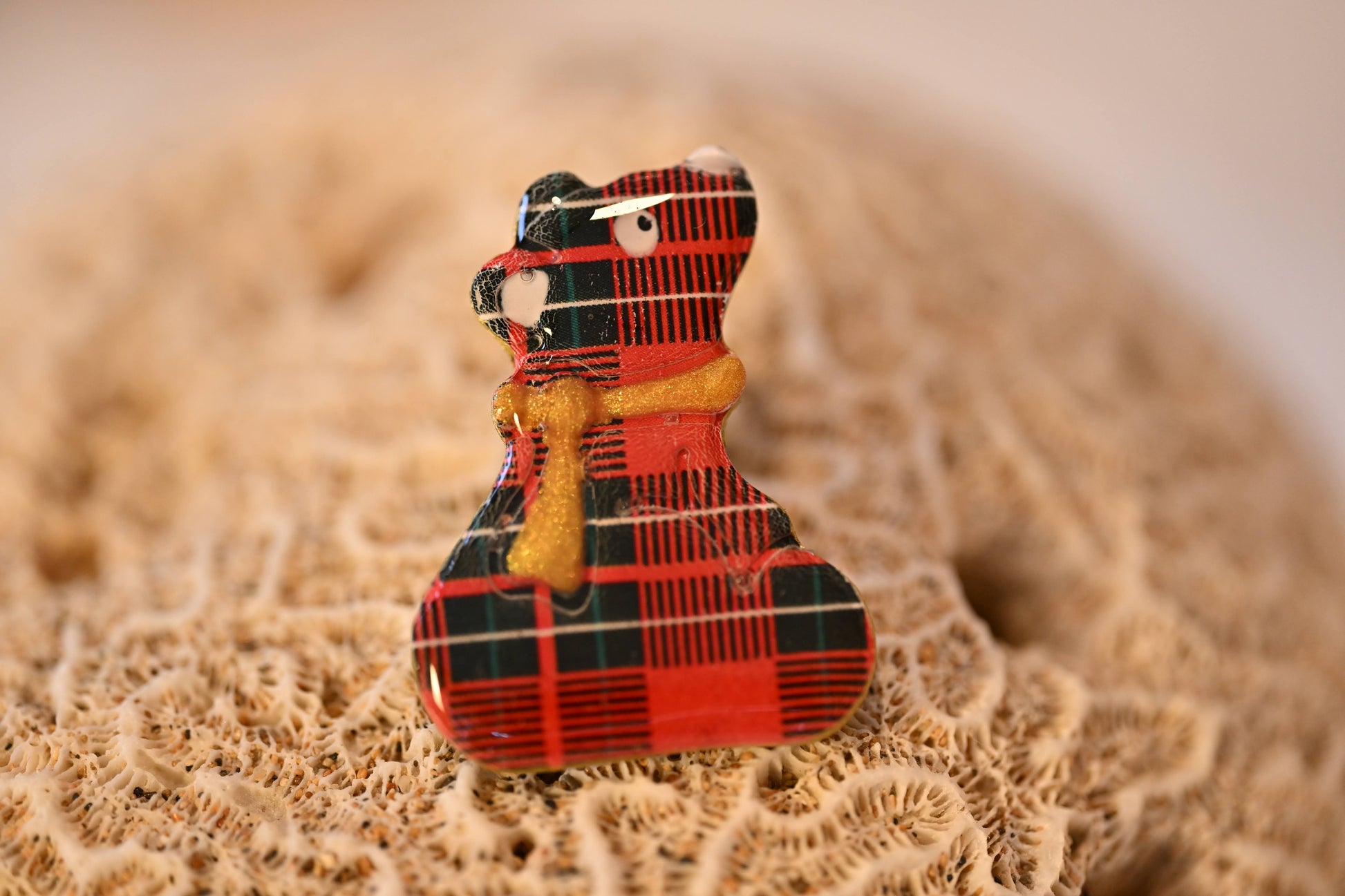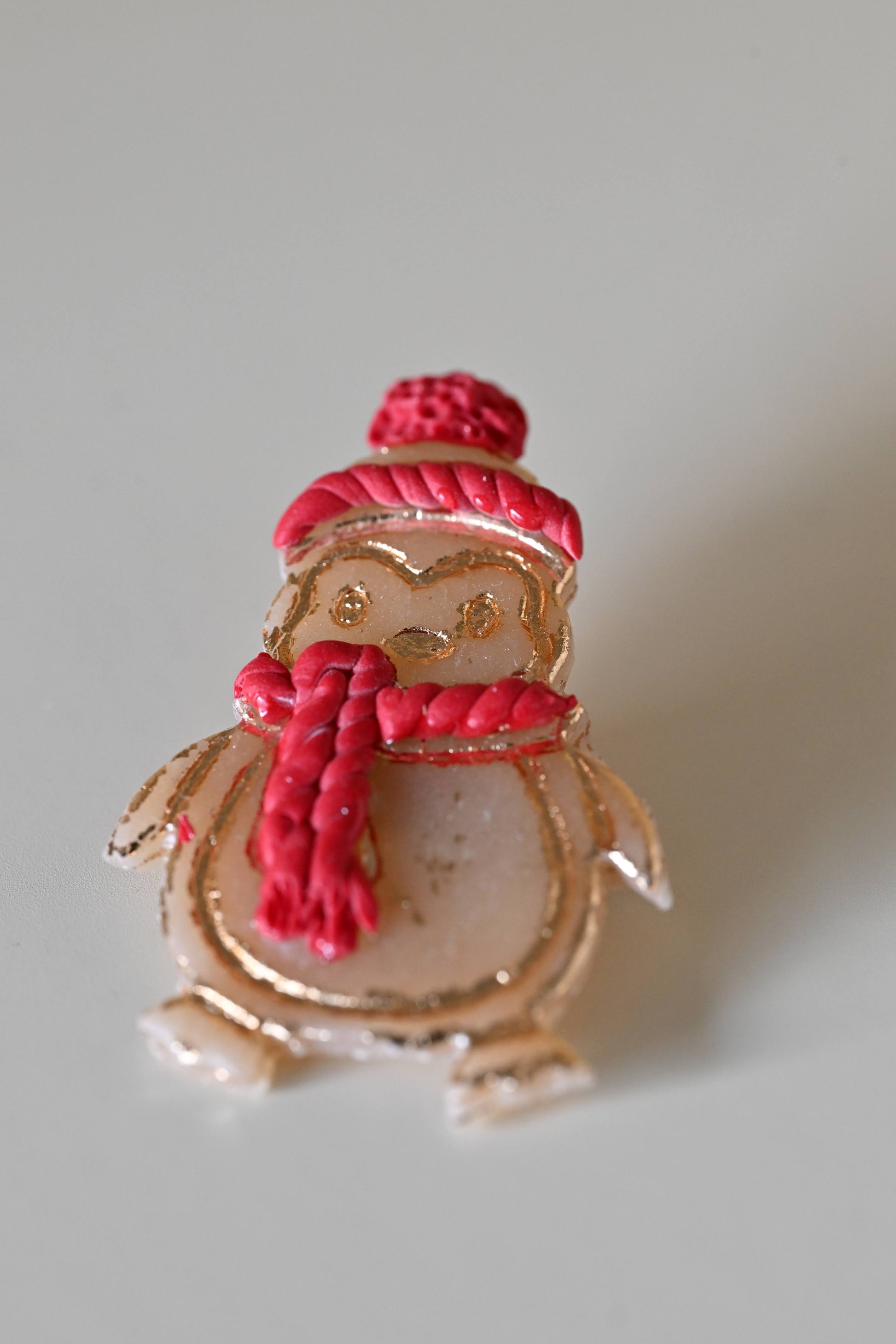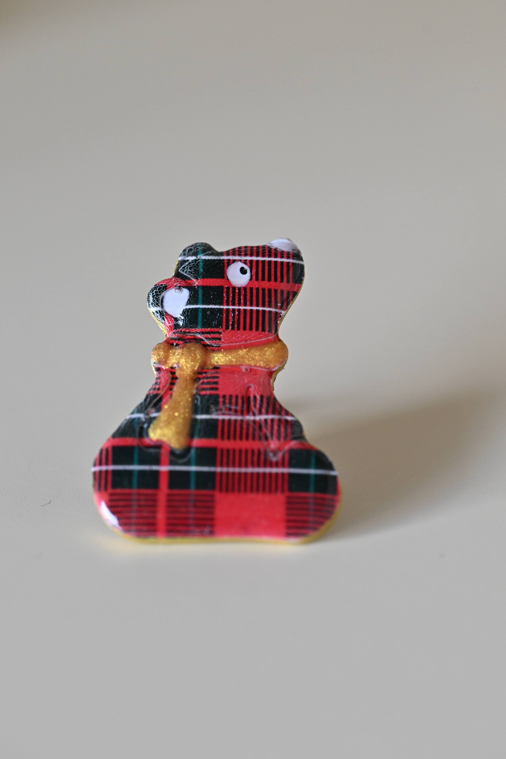Façonnées à la main en pâte polymère, ces broches représentent de petits compagnons d’hiver: bonhomme souriant, ourson vêtu de motifs écossais, aux formes douces et expressives.